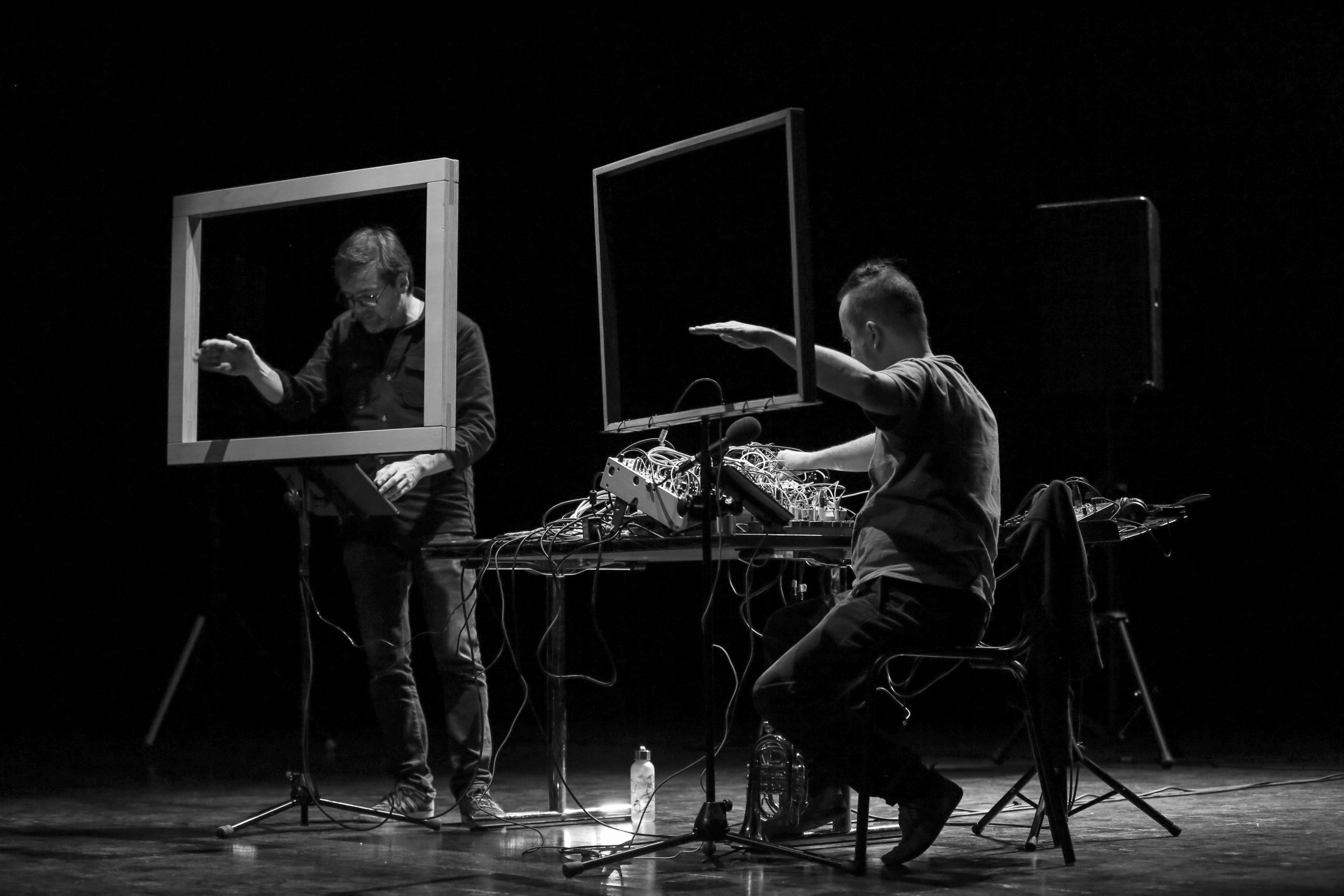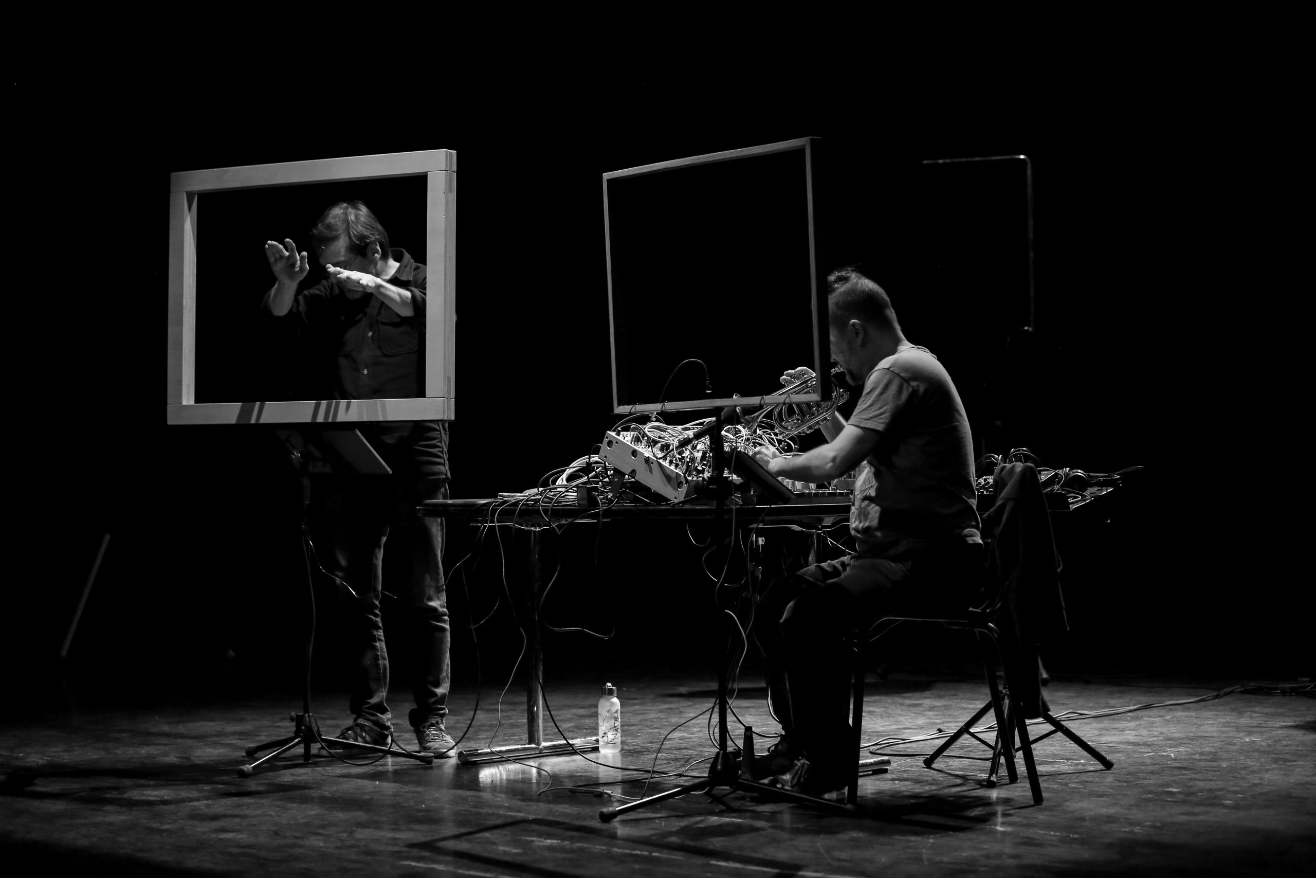 Patience and ingenuity; that’s what distinguishes this meeting of two outstanding experimenters. The French-Vietnamese percussionist Lê Quan Ninh has a classical music background; his interests include contemporary compositions, non-idiomatic improvisation as well as dance, video art and visual arts. His playing often employs extended techniques that make the drum sound like a string instrument or a synthesizer, and over decades of practice he has acquired a quite extraordinary feeling combined with precision and imagination. Mathieu Chamagne is originally a pianist who gradually turned to electroacoustic music and sound art, with an emphasis on creating new interactive devices and digital environments. In this duo, he plays his own instrument/installation, Apertures, which resembles window frames and converts hand movements into sound. While sounding together, the two seemingly so different instruments begin to sonically converge and eventually merge. (Alternativa Festival, Prague, 2024)